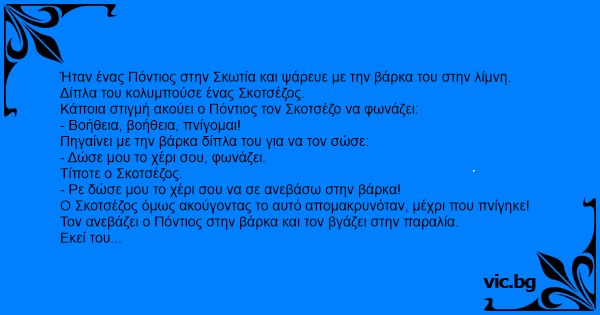 Ήταν ένας Πόντιος στην Σκωτία και ψάρευε με την βάρκα του στην λίμνη. Δίπλα του κολυμπούσε ένας Σκοτσέζος.