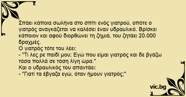 Σπάει κάποια σωλήνα στο σπίτι ενός γιατρού, οπότε ο γιατρός αναγκάζεται να καλέσει έναν υδραυλικό. Βρίσκει κάποιον και αφού διορθώνει τη ζημιά, του ζητάει 20.000 δραχμές.