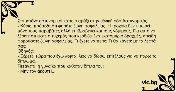 - Κύριε, πρόσεξα ότι φοράτε ζώνη ασφαλείας. Η τροχαία δεν τιμωρεί μόνο τους παραβάτες αλλά επιβραβεύει και τους νόμιμους. Για αυτό να ξέρετε ότι είστε ο τυχερός που κερδίζει ένα εκατομύριο δραχμές, επειδή φορούσατε ζώνη ασφαλείας. Τι έχετε να πείτε; Τι θα κάνετε με τα λεφτά σας;