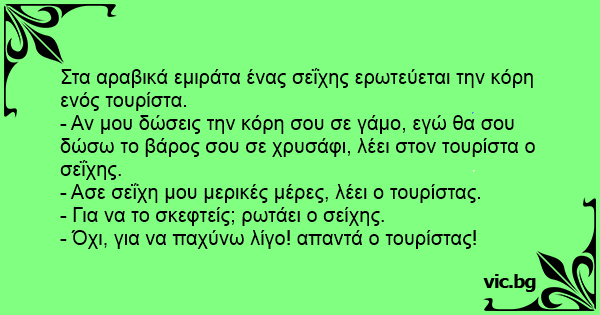 - Αν μου δώσεις την κόρη σου σε γάμο, εγώ θα σου δώσω το βάρος σου σε χρυσάφι, λέει στον τουρίστα ο σεΐχης.