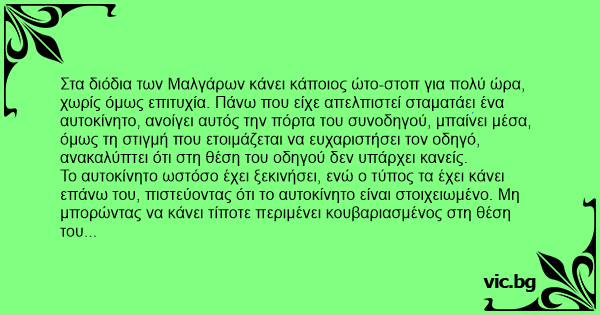 Στα διόδια των Μαλγάρων κάνει κάποιος ώτο-στοπ για πολύ ώρα, χωρίς όμως επιτυχία. Πάνω που είχε απελπιστεί σταματάει ένα αυτοκίνητο, ανοίγει αυτός την πόρτα του συνοδηγού, μπαίνει μέσα, όμως τη στιγμή που ετοιμάζεται να ευχαριστήσει τον οδηγό, ανακαλύπτει ότι στη θέση του οδηγού δεν υπάρχει κανείς.