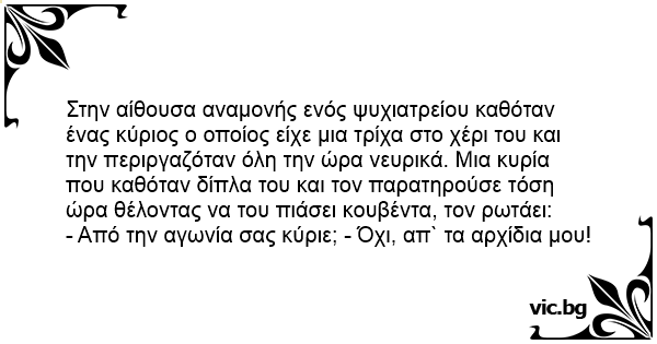 Στην αίθουσα αναμονής ενός ψυχιατρείου καθόταν ένας κύριος ο οποίος είχε μια τρίχα στο χέρι του και την περιργαζόταν όλη την ώρα νευρικά. Μια κυρία που καθόταν δίπλα του και τον παρατηρούσε τόση ώρα θέλοντας να του πιάσει κουβέντα, τον ρωτάει: