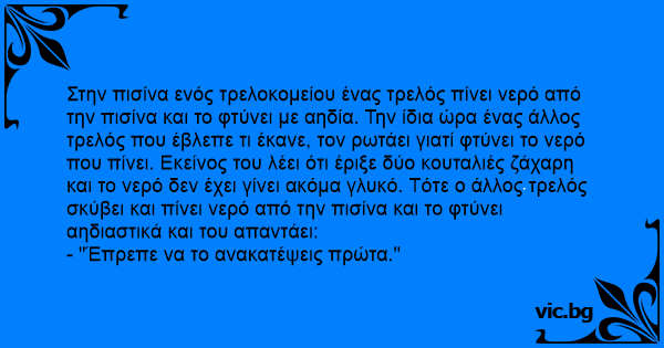 Στην πισίνα ενός τρελοκομείου ένας τρελός πίνει νερό από την πισίνα και το φτύνει με αηδία. Την ίδια ώρα ένας άλλος τρελός που έβλεπε τι έκανε, τον ρωτάει γιατί φτύνει το νερό που πίνει. Εκείνος του λέει ότι έριξε δύο κουταλιές ζάχαρη και το νερό δεν έχει γίνει ακόμα γλυκό. Τότε ο άλλος τρελός σκύβει και πίνει νερό από την πισίνα και το φτύνει αηδιαστικά και του απαντάει: