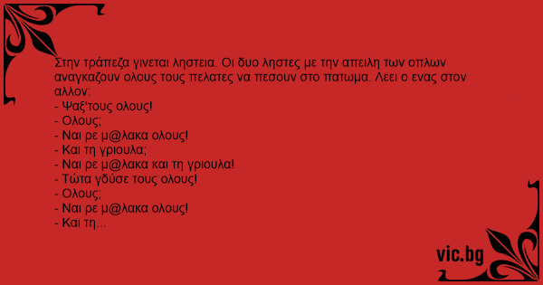 Στην τράπεζα γινεται ληστεια. Οι δυο ληστες με την απειλη των οπλων αναγκαζουν ολους τους πελατες να πεσουν στο πατωμα. Λεει ο ενας στον αλλον: