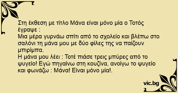Η μάνα μου λέει : Τοτέ πιάσε τρεις μπύρες από το ψυγείο! Εγώ πηγαίνω στη κουζίνα, ανοίγω το ψυγείο και φωνάζω : Μάνα! Είναι μόνο μία!.