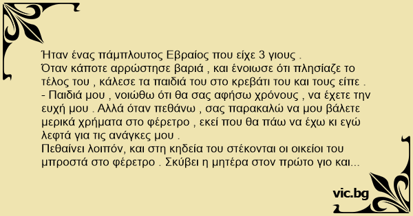 - Παιδιά μου , νοιώθω ότι θα σας αφήσω χρόνους , να έχετε την ευχή μου . Αλλά όταν πεθάνω , σας παρακαλώ να μου βάλετε μερικά χρήματα στο φέρετρο , εκεί που θα πάω να έχω κι εγώ λεφτά για τις ανάγκες μου .