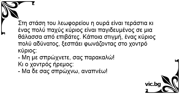 Στη στάση του λεωφορείου η ουρά είναι τεράστια κι ένας πολύ παχύς κύριος είναι παγιδευμένος σε μια θάλασσα από επιβάτες. Κάποια στιγμή, ένας κύριος πολύ αδύνατος, ξεσπάει φωνάζοντας στο χοντρό κύριος:
