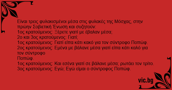 Είναι τρεις φυλακισμένοι μέσα στις φυλακές της Μόσχας, στην πρώην Σοβιετική Ένωση και συζητούν: