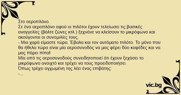 Σε ένα αεροπλάνο αφού οι πιλότοι έχουν τελείωσει τις βασικές αναγγελίες (βάλτε ζώνες κτλ.) ξεχνάνε να κλείσουν το μικρόφωνο και ακούγονται οι συνομιλίες τους.