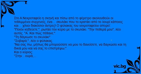 "Ποιόν κηδεύετε;", ρωτάει τον κύριο με το σκυλάκι. "Την πεθερά μου", λέει αυτός. "Α. Και πώς πέθανε;".