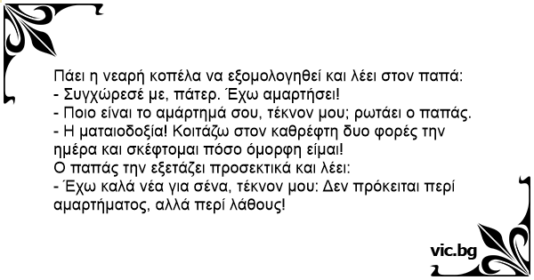 - Ποιο είναι το αμάρτημά σου, τέκνον μου; ρωτάει ο παπάς.