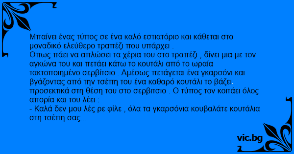Oπως πάει να απλώσει τα χέρια του στο τραπέζι , δίνει μια με τον αγκώνα του και πετάει κάτω το κουτάλι από το ωραία τακτοποιημένο σερβίτσιο . Αμέσως πετάγεται ένα γκαρσόνι και βγάζοντας από την τσέπη του ένα καθαρό κουτάλι το βάζει προσεκτικά στη θέση του στο σερβιτσιο . Ο τύπος τον κοιτάει όλος απορία και του λέει :