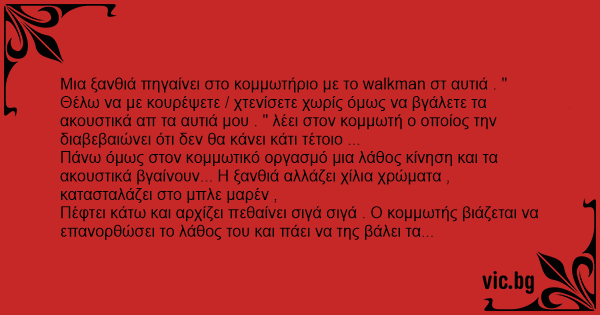 Μια ξανθιά πηγαίνει στο κομμωτήριο με το walkman στ αυτιά . " Θέλω να με κουρέψετε / χτενίσετε χωρίς όμως να βγάλετε τα ακουστικά απ τα αυτιά μου . " λέει στον κομμωτή ο οποίος την διαβεβαιώνει ότι δεν θα κάνει κάτι τέτοιο ...