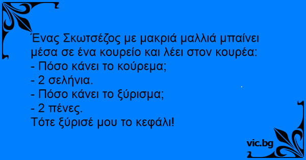 Ένας Σκωτσέζος με μακριά μαλλιά μπαίνει μέσα σε ένα κουρείο και λέει στον κουρέα: