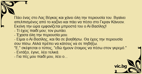 - Ένας 45χρονος εργοστασιάρχης πάει στο καζίνο και χάνει σε μια νύχτα όλη του την περιούσια και αποφασίζει να αυτοκτονήσει. Πάει στον ισθμό και την ώρα που είναι έτοιμος να πέσει βλέπει έναν...
