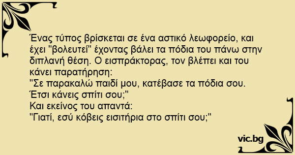 Ένας τύπος βρίσκεται σε ένα αστικό λεωφορείο, και έχει "βολευτεί" έχοντας βάλει τα πόδια του πάνω στην διπλανή θέση. Ο εισπράκτορας, τον βλέπει και του κάνει παρατήρηση: