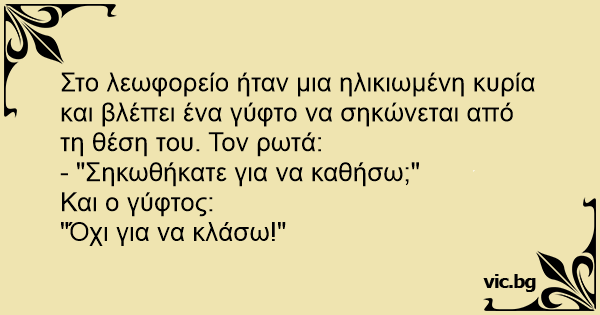 Στο λεωφορείο ήταν μια ηλικιωμένη κυρία και βλέπει ένα γύφτο να σηκώνεται από τη θέση του. Τον ρωτά: