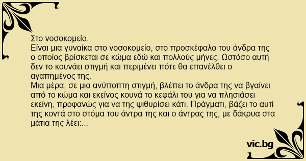 Είναι μια γυναίκα στο νοσοκομείο, στο προσκέφαλο του άνδρα της ο οποίος βρίσκεται σε κώμα εδώ και πολλούς μήνες. Ωστόσο αυτή δεν το κουνάει στιγμή και περιμένει πότε θα επανέλθει ο αγαπημένος της.