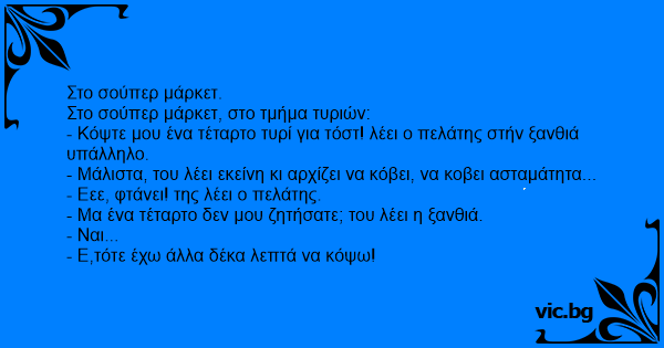 - Κόψτε μου ένα τέταρτο τυρί για τόστ! λέει ο πελάτης στήν ξανθιά υπάλληλο.