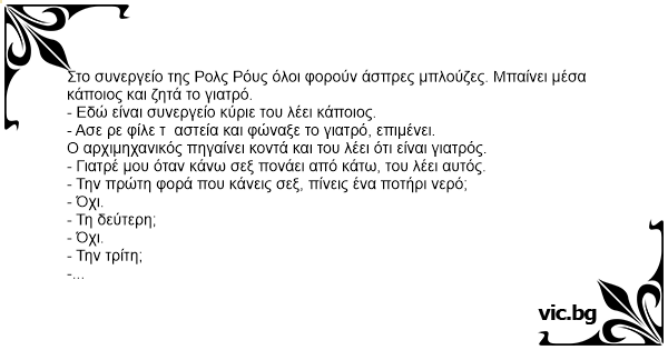Στο συνεργείο της Ρολς Ρόυς όλοι φορούν άσπρες μπλούζες. Μπαίνει μέσα κάποιος και ζητά το γιατρό.