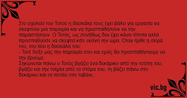 Στο σχολείο του Τοτού η δασκάλα τους έχει βάλει για εργασία να σκεφτούν μια παροιμία και να προσπαθήσουν να την παραστήσουν. Ο Τοτός, ως συνήθως δεν έχει κάνει τίποτα αλλά προσπαθούσε να σκεφτεί κάτι εκείνη την ώρα. Όταν ήρθε η σειρά του, του λέει η δασκάλα του: