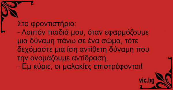 - Λοιπόν παιδιά μου, όταν εφαρμόζουμε μια δύναμη πάνω σε ένα σώμα, τότε δεχόμαστε μια ίση αντίθετη δύναμη που την ονομάζουμε αντίδραση.