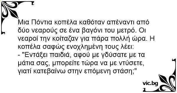 - "Εντάξει παιδιά, αφού με γδύσατε με τα μάτια σας, μπορείτε τώρα να με ντύσετε, γιατί κατεβαίνω στην επόμενη στάση;"