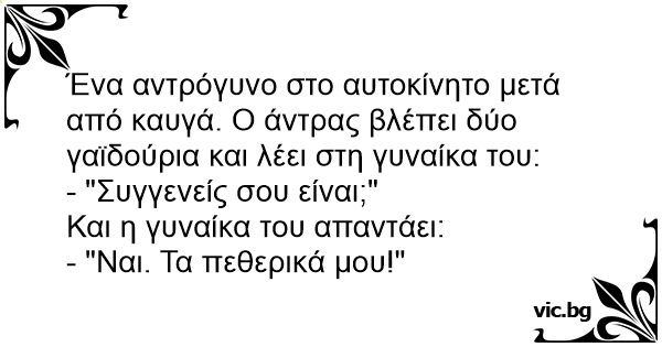 Ένα αντρόγυνο στο αυτοκίνητο μετά από καυγά. Ο άντρας βλέπει δύο γαϊδούρια και λέει στη γυναίκα του: