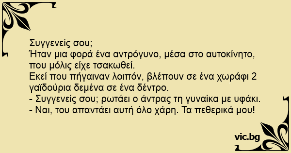 - Συγγενείς σου; ρωτάει ο άντρας τη γυναίκα με υφάκι.