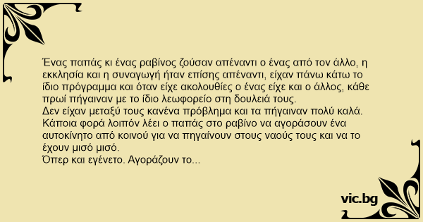 Κάποια φορά λοιπόν λέει ο παπάς στο ραβίνο να αγοράσουν ένα αυτοκίνητο από κοινού για να πηγαίνουν στους ναούς τους και να το έχουν μισό μισό.