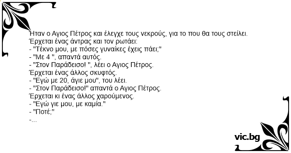 Ήταν ο Αγιος Πέτρος και έλεγχε τους νεκρούς, για το που θα τους στείλει. Έρχεται ένας άντρας και τον ρωτάει: