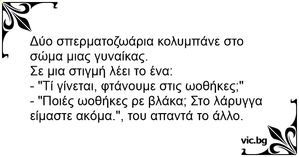 - "Ποιές ωοθήκες ρε βλάκα; Στο λάρυγγα είμαστε ακόμα.", του απαντά το άλλο.