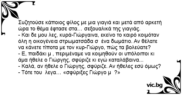 - Και δε μου λες, κυρά-Γιώργαινα, εκείνο το καιρό κοιμόταν όλη η οικογένεια στρωματσάδα σ  ένα δωμάτιο. Αν θέλατε να κάνετε τίποτα με τον κυρ-Γιώργο, πώς τα βολεύατε?