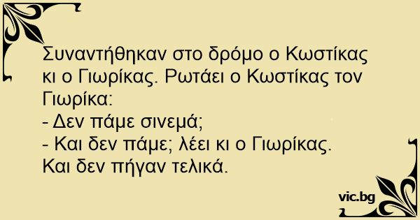 Συναντήθηκαν στο δρόμο ο Κωστίκας κι ο Γιωρίκας. Ρωτάει ο Κωστίκας τον Γιωρίκα: