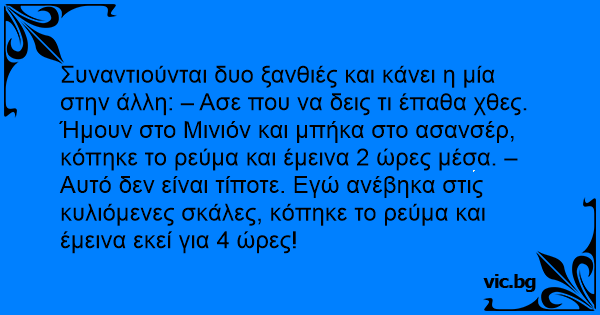 Συναντιούνται δυο ξανθιές και κάνει η μία στην άλλη: – Ασε που να δεις τι έπαθα χθες. Ήμουν στο Μινιόν και μπήκα στο ασανσέρ, κόπηκε το ρεύμα και έμεινα 2 ώρες μέσα. – Αυτό δεν είναι τίποτε. Εγώ ανέβηκα στις κυλιόμενες σκάλες, κόπηκε το ρεύμα και έμεινα εκεί για 4 ώρες!