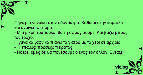- Οδοντίατρος: Κυρία μου, τι κάνετε??? Έχετε πιάσει τα αρχίδια μου. - Ακριβώς ! Και από δω και πέρα δε θα πονέσουμε ο ένας τον άλλον, έτσι ;