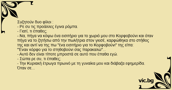 - Να, πήγα να κόψω ένα εισιτήριο για το χωριό μου στο Κορφοβούνι και όταν πήγα να το ζητήσω από την πωλήτρια στον γκισέ, καρφώθηκα στο στήθος της και αντί να της πω "ένα εισιτήριο για το Κορφοβούνι" της είπα: