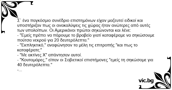 Σ` ένα παγκόσμιο συνέδριο επιστημόνων είχαν μαζευτεί ειδικοί και υποστήριζαν πως οι ανακαλύψεις τις χώρας ήταν ανώτερες από αυτές των υπολοίπων. Οι Αμερικάνοι πρώτοι σηκώνονται και λένε: - "Εμείς πρέπει να πάρουμε το βραβείο γιατί καταφέραμε να σηκώσουμε πούτσα νεκρού για 20 δευτερόλεπτα." - "Εκπληκτικό," αναφώνησαν τα μέλη τις επιτροπής "και πως το καταφέρατε;" - "Με ακτίνες Χ" απάντησαν αυτοί. - "Κουταμάρες," είπαν οι Σοβιετικοί επιστήμονες "εμείς τη σηκώσαμε για 40 δευτερόλεπτα." - "Πρωτοφανές!," είπαν τα μέλη τις επιτροπής, "και πως το κατορθώσατε;" - "Με ακτίνες Γ," είπαν αυτοί. - "Μαλακίες," είπαν οι Έλληνες ερευνητές. - "Εμείς το καταφέραμε με συνεχή διάρκεια." - "Μα είναι αδιανόητο," είπαν όλοι "πως το καταφέρατε;" - "Με ακτίνες ποδηλάτου."