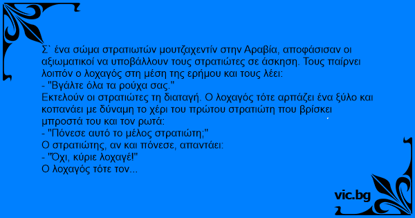 Σ` ένα σώμα στρατιωτών μουτζαχεντίν στην Αραβία, αποφάσισαν οι αξιωματικοί να υποβάλλουν τους στρατιώτες σε άσκηση. Τους παίρνει λοιπόν ο λοχαγός στη μέση της ερήμου και τους λέει: