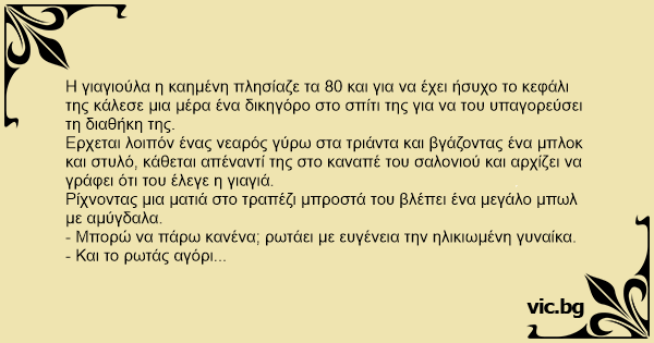 Η γιαγιούλα η καημένη πλησίαζε τα 80 και για να έχει ήσυχο το κεφάλι της κάλεσε μια μέρα ένα δικηγόρο στο σπίτι της για να του υπαγορεύσει τη διαθήκη της.