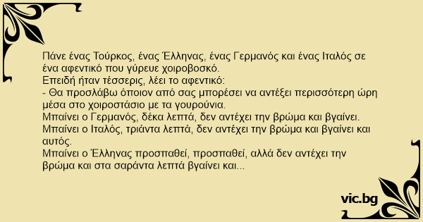 Πάνε ένας Τούρκος, ένας Έλληνας, ένας Γερμανός και ένας Ιταλός σε ένα αφεντικό που γύρευε χοιροβοσκό.
