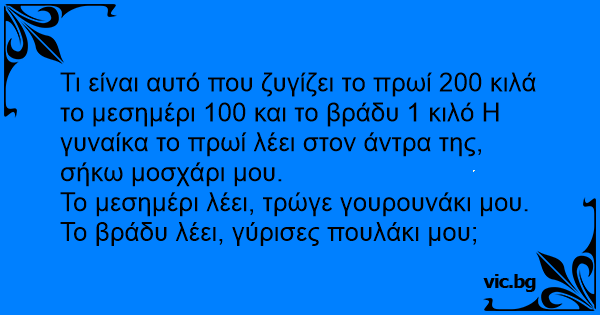 Τι είναι αυτό που ζυγίζει το πρωί 200 κιλά το μεσημέρι 100 και το βράδυ 1 κιλό Η γυναίκα το πρωί λέει στον άντρα της, σήκω μοσχάρι μου.