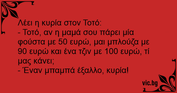 - Τοτό, αν η μαμά σου πάρει μία φούστα με 50 ευρώ, μαι μπλούζα με 90 ευρώ και ένα τζιν με 100 ευρώ, τί μας κάνει;