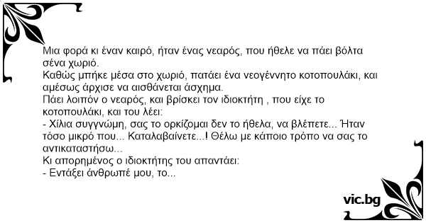 Πάει λοιπόν ο νεαρός, και βρίσκει τον ιδιοκτήτη , που είχε το κοτοπουλάκι, και του λέει:
