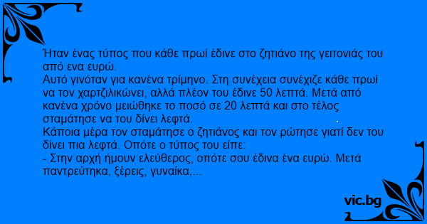 Κάποια μέρα τον σταμάτησε ο ζητιάνος και τον ρώτησε γιατί δεν του δίνει πια λεφτά. Οπότε ο τύπος του είπε: