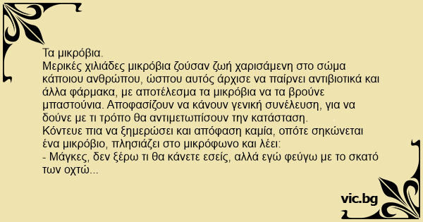 Μερικές χιλιάδες μικρόβια ζούσαν ζωή χαρισάμενη στο σώμα κάποιου ανθρώπου, ώσπου αυτός άρχισε να παίρνει αντιβιοτικά και άλλα φάρμακα, με αποτέλεσμα τα μικρόβια να τα βρούνε μπαστούνια. Αποφασίζουν να κάνουν γενική συνέλευση, για να δούνε με τι τρόπο θα αντιμετωπίσουν την κατάσταση.