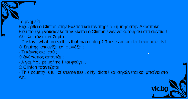 Εκεί που γυρνούσαν λοιπόν βλέπει ο Clinton έναν να κατουράει στα αρχαία ! Λέει λοιπόν στον Σημίτη:
