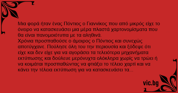 Μια φορά ήταν ένας Πόντιος ο Γιαννίκος που από μικρός είχε το όνειρο να κατασκευάσει μια μέρα πλαστά χαρτονομίσματα που θα είναι πανομοιότυπα με τα αληθινά.