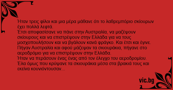 Έτσι αποφασίσανε να πάνε στην Αυστραλία, να μαζέψουν σκίουρους και να επιστρέψουν στην Ελλάδα για να τους μοσχοπουλήσουν και να βγάλουν κανά φράγκο. Και έτσι και έγινε. Πήγαν Αυστραλία και αφού μάζεψαν τα σκιουράκια, πήγανε στο αεροδρόμιο για να επιστρέψουν στην Ελλάδα.