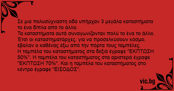 Η ταμπέλα του καταστήματος στα δεξιά έγραφε "ΕΚΠΤΩΣΗ 50%". Η ταμπέλα του καταστήματος στα αριστερά έγραφε "ΕΚΠΤΩΣΗ 70%". Και η ταμπέλα του καταστήματος στο κέντρο έγραφε "ΕΙΣΟΔΟΣ".